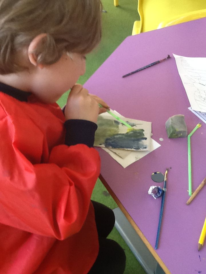 Today, we had great fun creating different textures using paint. We have been learning about the primary colours and making different tones and shades. We will use our painted tiles to create a landscape collage inspired by Romare Bearden. We look forward to sharing our art with you at the Art Gallery on December 13th.