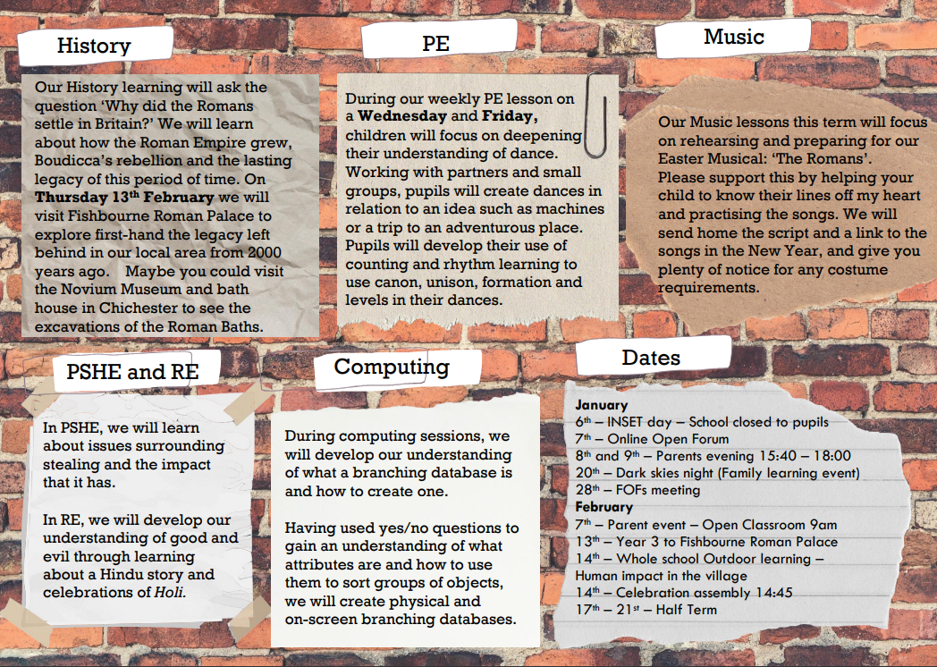 Parent information letters are displayed outside each classroom door and below for your reference. We have an exciting half-term ahead, culminating with a trip to Fishbourne Roman Palace on the 13th Feb.