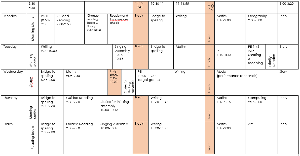 Here is our timetable for the half-term. Please note that this may change depending on what other learning or events are happening in school each week.